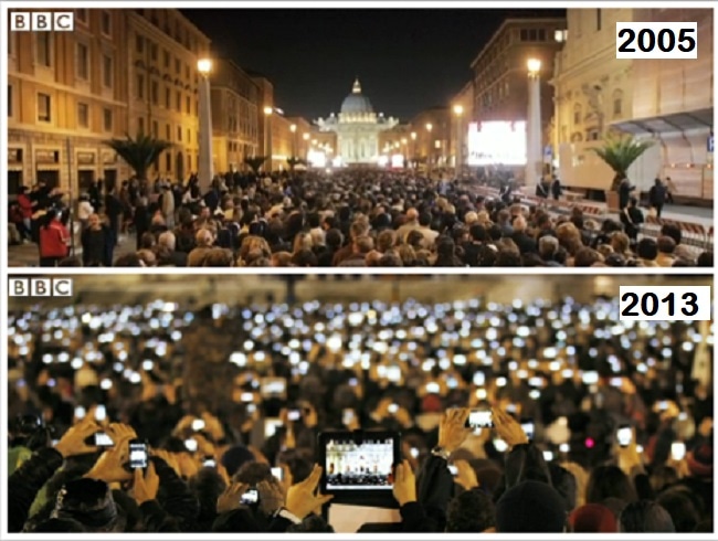 Es muy interesante comparar las vigilias y como en solo 8 años, entre un cónclave y otro, la tecnología nos hace tomar conciencia de la velocidad de los cambios. Podemos ver aquí un cambio significativo y significante.