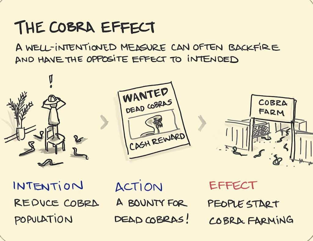 Por aquí siguen vivas todavía centenares de miles de cobras, que fueron recicladas de aquel viejo fracaso colonial inglés por exterminarlas. Aquí también utilizaron recompensas y se dedicaron a criarlas para venderlas, cuando los gobernantes se percataron del ardid desmantelaron el decreto y paso algo peor, los «cobreros» ante la cobra que no cobra, las soltaron generando un caos absoluto. #explóralo.